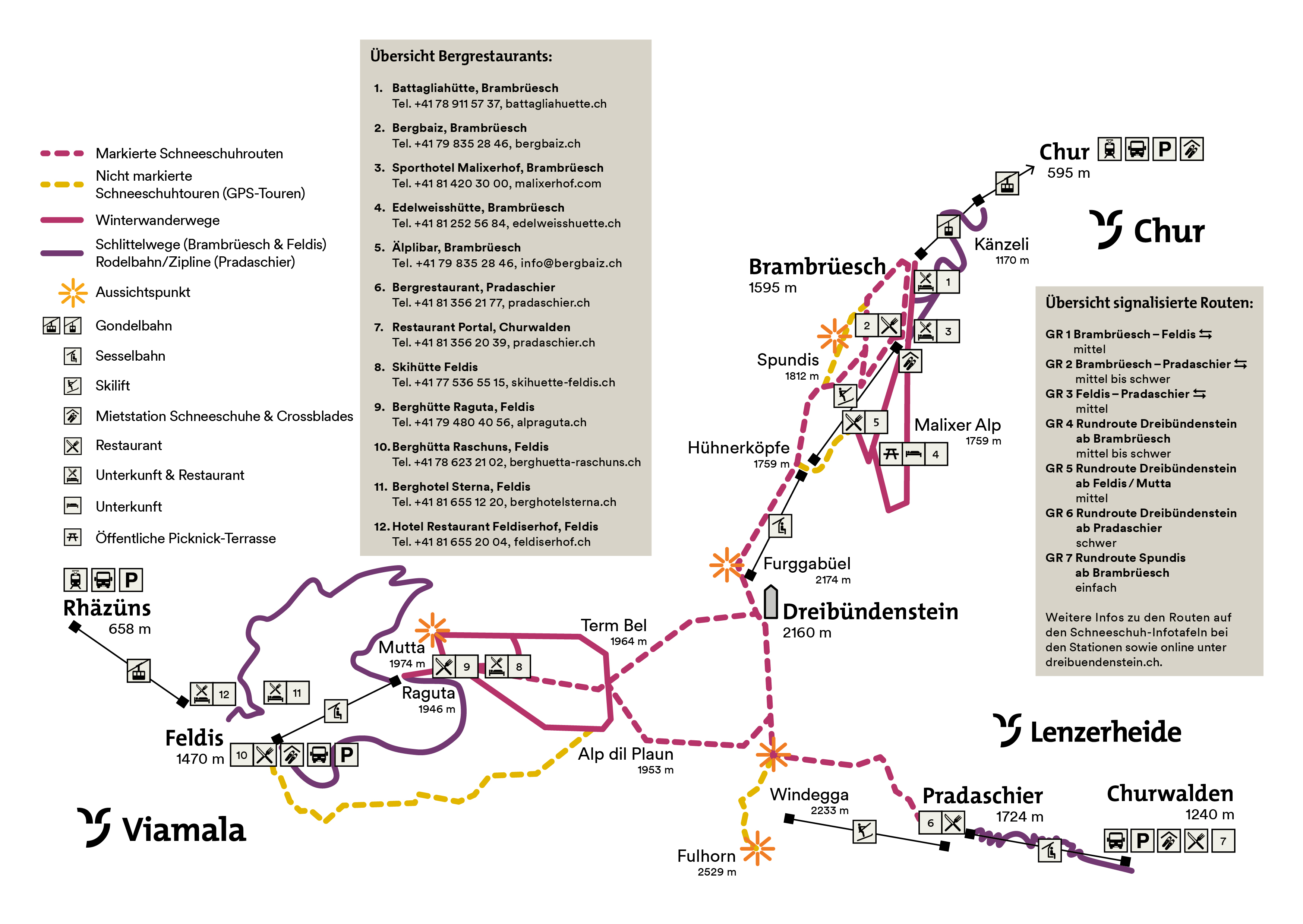 Die Schneeschuh-Arena Dreibündenstein verbindet die drei Wintersportgebiete Brambrüesch, Feldis und Pradaschier im Herzen von Chur, Viamala und Lenzerheide. Gut ausgeschilderte Routen führen von allen drei Stationen hinauf zur weiten Hochebene – ein idealer Ausgangspunkt für abwechslungsreiche Rundtouren mit Schneeschuhen.